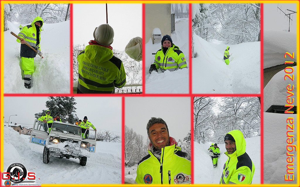 Sono giorni di duro lavoro. Il manto nevoso cresce di ora in ora; la bufera non si placa mai ed i primi edifici cominciano a crollare sotto il peso della neve. I nostri compiti sono i più svariati: Apriamo le “rotte” per raggiungere le famiglie o le persone isolate; alcuni non riescono a raggiungere la legnaia o non hanno viveri e medicinali. Effettuiamo anche delle evacuazioni (in totale saranno 330 persone solo a Novafeltria);  i loro edifici sono letteralmente piegati da un carico di neve ingente, anche 300 cm, e le strutture mostrano segni di cedimento. Nel territorio dell’Alta Val Marecchia sono molte le pensione anziane; alcune rimangono isolate e non danno notizie, è quindi bene andare sul posto a controllare. I pesanti fuoristrada Land Rover arrancano come muli su strade inesistenti, dove non si vedono più cartelli, alberi, automezzi. Tutto è sepolto ed il silenzio irreale è rotto solo dal rumore delle nostre catene e del potente motore turbodiesel. La notte fra Venerdì e Sabato 10 ed 11 febbraio è la più drammatica: Cadono oltre 70 cm di neve e le poche strade appena agibili ritornano impraticabili. Ed allora si procede a piedi; una missione, due, tre.. le mani fanno male e le dita sono congelate, ma bisogna arrivare alla prossima casa.. e prima possibile. Alcune strutture per anziani in località Pennabilli e Sant’Agata Feltria hanno bisogno di personale e di cure mediche per gli invalidi e gli anziani presenti. Noi facciamo il possibile, non abbiamo il “gatto delle nevi” e si procede quindi a piedi, con carte topografiche, gps, pala ed una immane fatica. Anche gli animali nelle fattorie soffrono. Alcuni sono letteralmente sepolti vivi nei loro ricoveri sotto tre metri di neve. E’ una situazione allucinante, dovremo scavare addirittura in verticale per raggiungere l’uscio e poter somministrare loro acqua e foraggio. Quando sentiamo i primi istintivi versi, ci si apre il cuore. Sono ancora vivi.